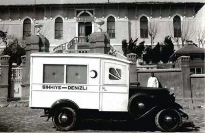 Resim 1: Denizli Memleket Hastahanesi’nin ilk ambulansı (1933) – Coşkun Önen Arşivi. Geçmişten Günümüze Denizli Dergisi; 2004:37.