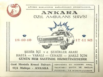 Resim 2: Ankara Özel Ambulans Servisi - Hasan Erbay Arşivi.1980’li yıllara gelindiğinde Türkiye’de hem kamu hastanelerinin hem de özel sektörün elinde çok sayıda ambulans bulunmaktadır. Ancak bu ambulanslarla verilen acil sağlık hizmeti genelde hastane temelli, sistemsiz ve dağınık haldedir.15 Bu araçların verimli biçimde kullanımı, yönetimi ve personel bakımından etkili bir şekilde hizmet vermesi sağlanamamaktadır. Ülke çapında, Sağlık Bakanlığı’nın elindeki yüzlerce ambulans mesai saatleri haricinde görev yapmamaktadır.16 Üstelik bu araçların büyük çoğunluğu eski model, tıbbi-teknik donanımdan yoksun ve atıl vaziyettedir. Bu nedenle o dönemde, hastanelerden bağımsız özel ambulans birimleri ortaya çıkmaya başlamıştır. (Resim 2)