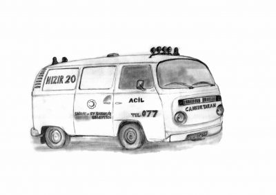 Resim 3: Hızır Acil Servis’in ilk ambulanslarından bir örnek, karakalem çalışması - Hasan Erbay Arşivi.