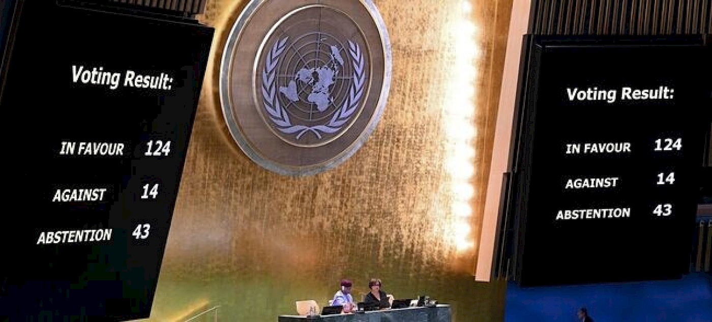 BM Genel Kurulu, İsrail Hükümeti'nin BM Anayasası (Şartı), uluslararası hukuk ve BM kararları kapsamındaki yükümlülüklerini "sürekli ve tamamen göz ardı etmesini ve ihlal etmesini" şiddetle kınadı ve bu tür ihlallerin bölgesel ve uluslararası barış ve güvenliği "ciddi şekilde tehdit ettiğini" vurguladı.