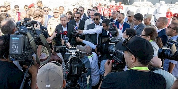 BM Genel Sekreteri António Guterres, 20 Ekim 2023 tarihinde hayat kurtaran yardımların Gazze Refah sınır kapısının önünde güçlü bir çağrıda bulunurken, BM insani yardım görevlileri Gazze sınırı boyunca yardım…