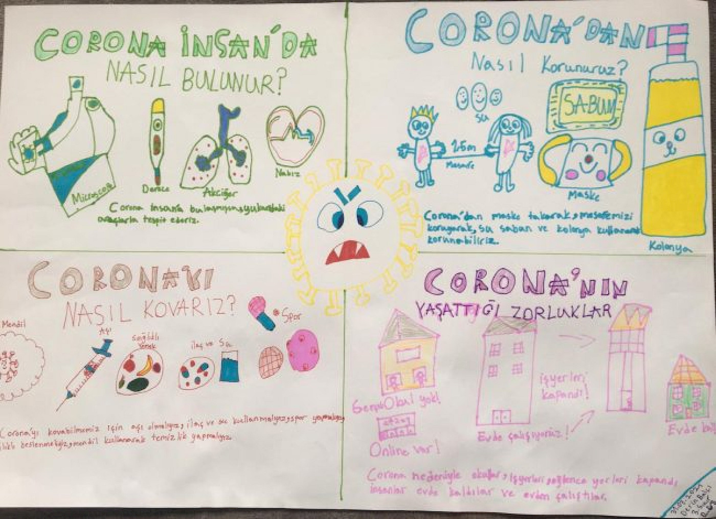 Korona ve Etkilerini Dört başlık halinde resimleyen ve tanımlayan 3. Sınıf Öğrencisi Derin Balcı'nın görüşleri bu resim ve alt yazılarda ifadesini bulmuştur.
