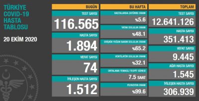 Sağlık Bakanı Dr. Fahrettin Koca, korona virüsü salgını nedeniyle yaşanan yeni can kaybını ve hasta sayısını açıkladı. 20 Ekim 2020 tarihinde yapılan 116 bin 565 testle birlikte toplam test sayısı 12 milyon 641 bin 126 oldu. 24 saatte 74 kişi hayatını kaybederken 1.894 yeni hasta tespit edildi. Ağır hasta sayımız 1.545’e yükseldi.