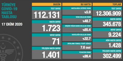 Sağlık Bakanlığı, Türkiye'nin korona virüsü hasta tablosunu açıkladı. 17 Ekim 2020 Cumartesi gününün verilerine göre 71 kişi hayatını kaybederken 1.723 yeni hasta tespit edildi. Sağlık Bakanı Dr. Koca "Ağır hasta sayısını düşürecek olan hastalığın bulaş yollarını engellemektir. Bunun için şuan en önemli silahımız tedbirlere birlikte uymak" dedi.
