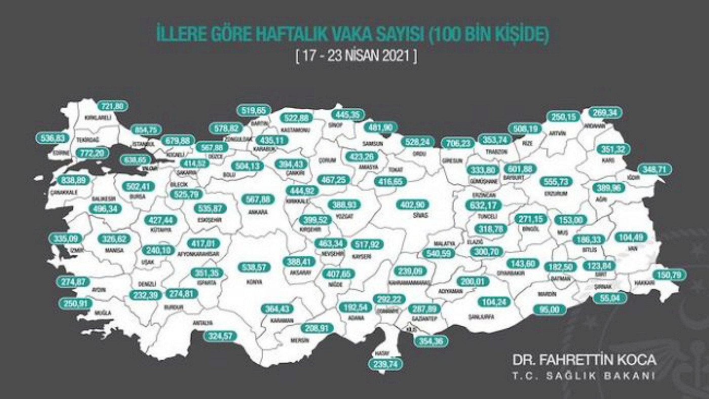 İllere göre haftalık Koronavirüs sayısı (100 bin kişide) (17-23 Nisan 2021)