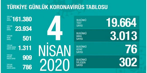 Türkiye'de ve Dünya'da 4 Nisan 2020' de Yeni Koronavirüs'te (Covid-19) son durum