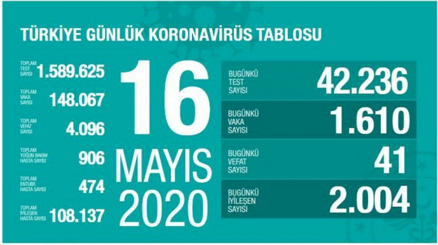 Sağlık Bakanı Dr. Fahrettin Koca'nın 16 Mayıs 2020 tarihinde açıkladığı yeni verilere göre son 24 saatte Türkiye'de 41 yurttaş koronavirüs nedeniyle yaşamını yitirdi.