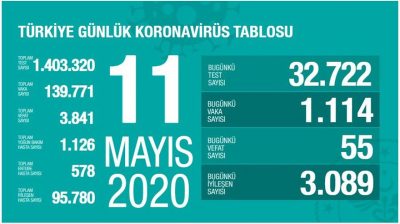 Sağlık Bakanı Dr. Fahrettin Koca, bugün 55 kişinin hayatını kaybettiğini belirtirken 1.114 yeni vaka görüldüğünü açıkladı. Toplam can kaybı 3.841'e, toplam vaka sayısı 139 bin 771'e yükseldi. Dün 1.542 vaka tespit edilmiş, 47 kişi de yaşamını yitirmişti. Günlük corona virüsü tablosuna göre, bugün 32 bin 722 test yapıldı. Testler sonucunda 1. 114 yeni vaka tespit edildiği açıklandı. Bugün 3.089 hastanın iyileştiği duyurulurken, toplam 95 bin 780 kişinin iyileştiği aktarıldı. Toplamda 1 milyon 403 bin 320 test yapıldı. Öte yandan toplam yoğun bakım hasta sayısının 1.126, toplam entübe hasta sayısının da 578 olduğu açıklandı.