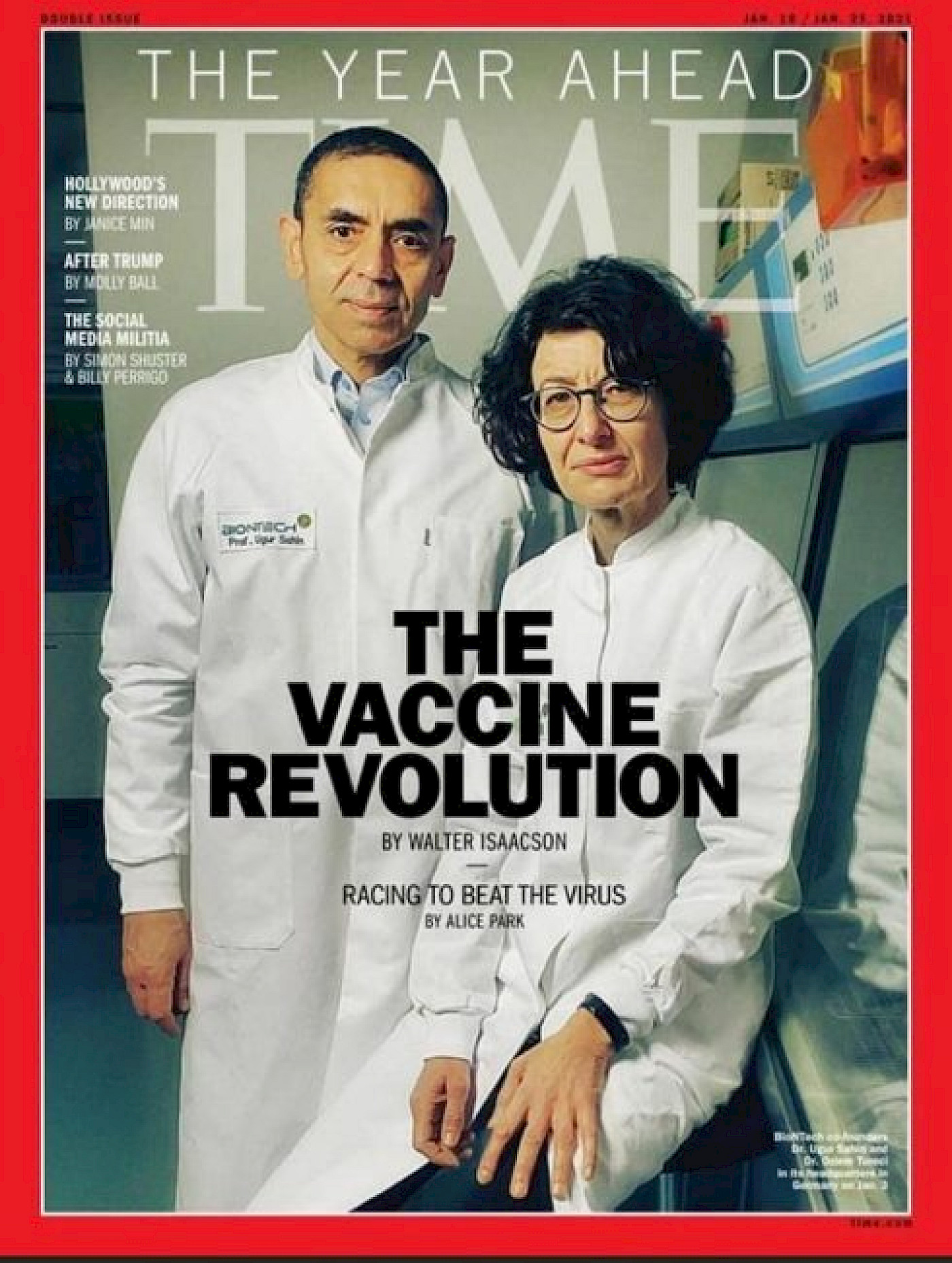 2021'in ilk sayısında çift kapakla çıkan TIME, ABD sayısında Kongre baskınına yer verirken, 'The Year Ahead' özel sayısında ise "Aşı Devrimi" manşetiyle kapakta Prof. Dr. Uğur Şahin ve Dr. Özlem Türeci'ye yer verdi.