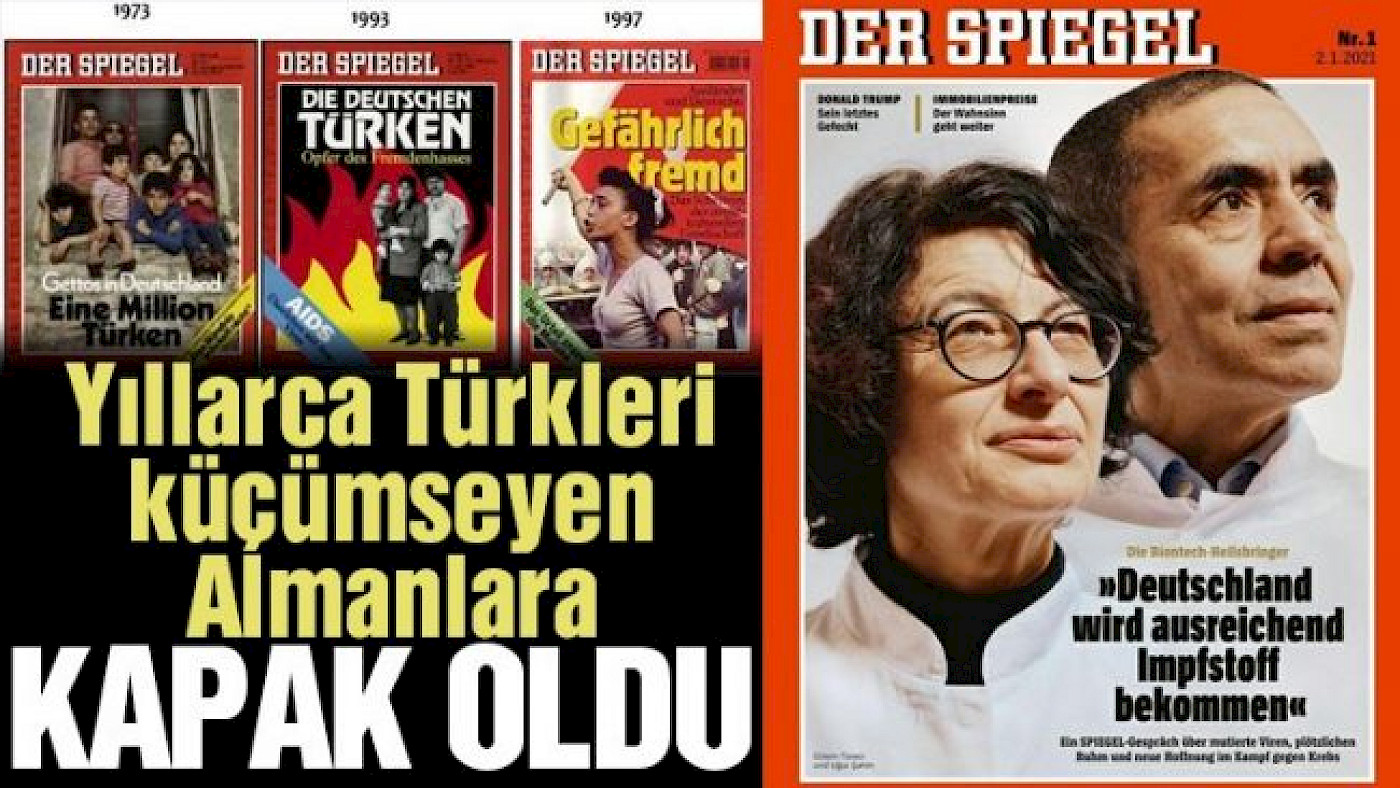 Türkler’i aşağılamak için "ALDİ torbaları" sallayan Alman taraftarlarla, "Türkler geliyor kaçın. Tehlikeli yabancı" manşetleri atan Alman medyasına, iki Türk çok güzel ders verdi. Corona aşısını bulan Uğur Şahin ve Özlem Türeci, Türkler aleyhine sayısız yazılar yazan Der Spiegel’e kapak oldu. Hem de iki anlamda… Sözcü Gazetesi Dünya haberleri sayfası için haber hazırlayan Ali Gülen kaleme aldı.