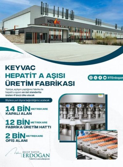 Öte yandan Cumhurbaşkanı Erdoğan, sosyal medya hesabından KeyVac Hepatit A Aşısı Üretim Fabrikası’na dair paylaşımda bulundu.