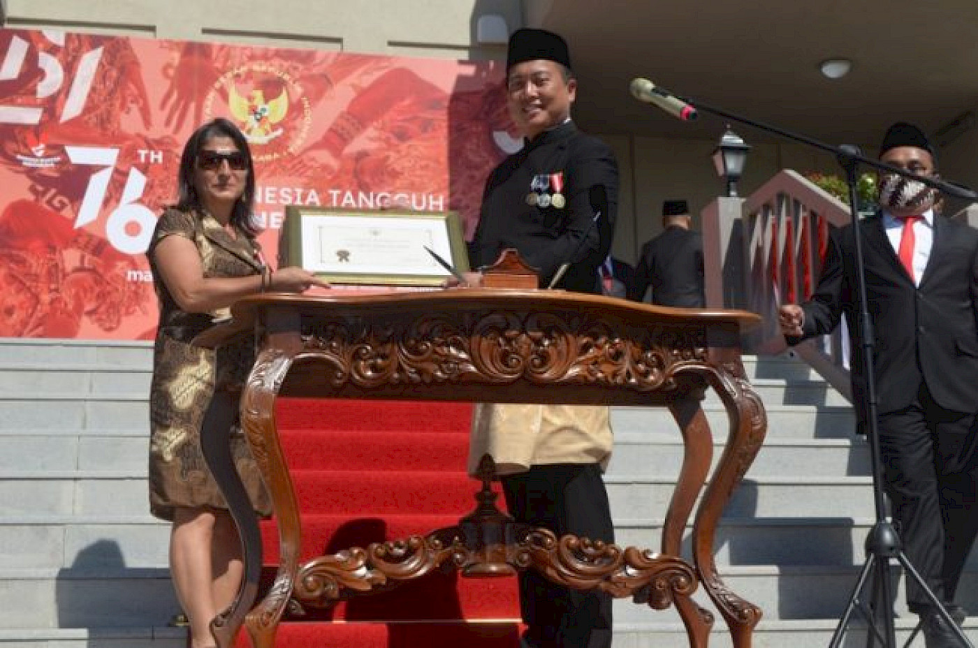 Bağımsızlık Günü kutlamasına Büyükelçi İkbal'in nazik daveti ile katıldım ve bir sürpriz ile karşılaştım. Endonezya ile ticaret yapan bazı işadamları ve Türkiye'deki Fahri Konsoloslar ile birlikte bana da bir teşekkür belgesi takdim edildi. Endonezya dostu sayılarak paha biçilmez nişanı ve takdir belgesini almaktan duyduğum onur ve mutluluğu bu sayfada paylaşmak isterim.