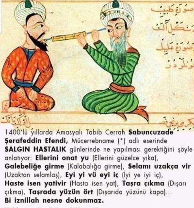 Şerafettin Efendi, Mücerreb-Name adlı eserinde, Salgın Hastalık günlerinde Ellerini onat yu (Ellerini güzelce yıka), Galebeliğe girme (Kalabalığa girme), Selamı uzakça vir (Uzaktan selamlaş), Eyi yi vü eyi iç (İyi ye iyi iç), Hasta isen yativir (Hasta isen yat), Taşra çıkma (Dışarı çıkma) tavsiyelerinde bulunuyor.1385-1468 yılları arasında yaşayan Şerefeddin bin Ali bin el Hac-İlyas-Sabuncuoğlu, hekimler ve bilginler yetiştiren bir ailenin ferdi. İlk eğitimini gördükten sonra, Amasya Darüşşifası'nın ünlü hekimlerinden Nahcivani'den tıp eğitimi almış, 17 yaşından itibaren, zamanının geleneklerine göre usta-çırak usulüyle hekimliğe başlamış. Öğrendiği pratik tıp bilgilerini, okuduğu kitaplar ve yaptığı gözlemlerle derinleştirmiş.