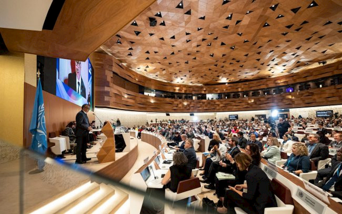 The high-level welcome to the 76th World Health Assembly at the Palais des Nations in Geneva, Switzerland, on 21 May 2023. Pictured here: Video statement by H.E Antonio Guterres,