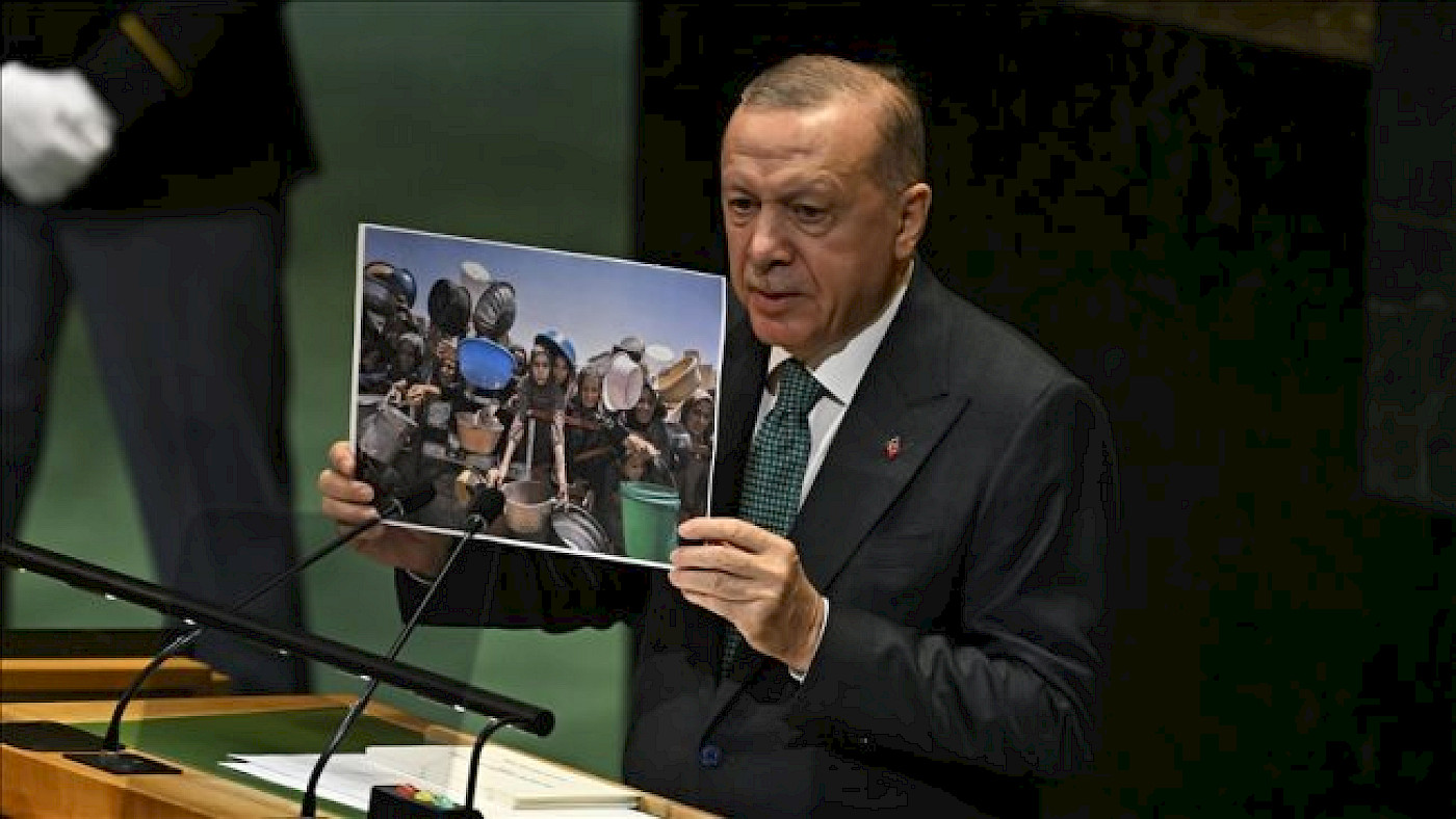 İkinci sebep bu yılki BM Genel Kuruluna damga vuran mesele, Gazze soykırımı ve Filistin meselesi ile ilgili. İsrail’in yayılmacı politikalarının yaratacağı tehlikelere ilk dikkat çeken aktörlerden biriydi Türkiye. Sayın Erdoğan’ın 2019 konuşması ve İsrail’in Filistin aleyhine nasıl yayıldığını gösteren haritalar hala zihinlerde. Meselenin başından itibaren Gazze’deki insani krize karşı tedbir alınması gerektiğini söyleyen, İsrail’in soykırım suçu işlediğini ilk dillendiren, iki devletli çözüm ve sadece Gazze’de değil, Batı Şeria ve Doğu Kudüs’te de Filistinlilerin haklarının tanınması gerektiğini söyleyen bir devlet olarak Türkiye’nin bu konuda ne diyeceği aslında tahmin ediliyordu. Ama Cumhurbaşkanı Erdoğan'ın bu konuda yani Gazze’deki insanlık suçunun önlenmesi gerekliliğini, İsrail yayılmacılığının durdurulması gerektiğini, hangi bağlamda söyleyeceği merak ediliyordu.