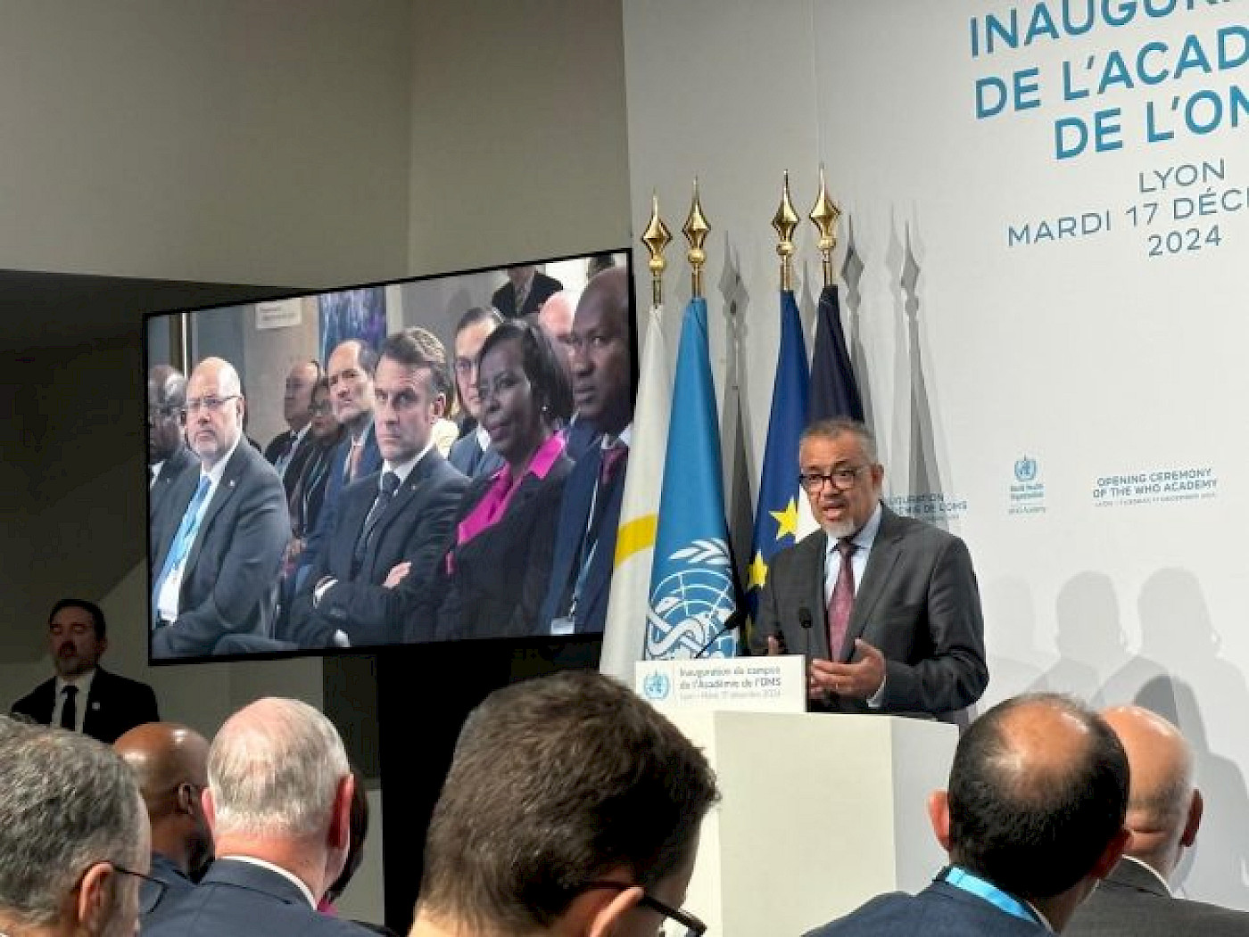 Cumhurbaşkanı Macron, DSÖ Genel Direktörü Dr. Tedros ve Fransa Sağlık Bakanı ile Lyon'da "DSÖ Akademisi açılış töreninde (17.12.2024)