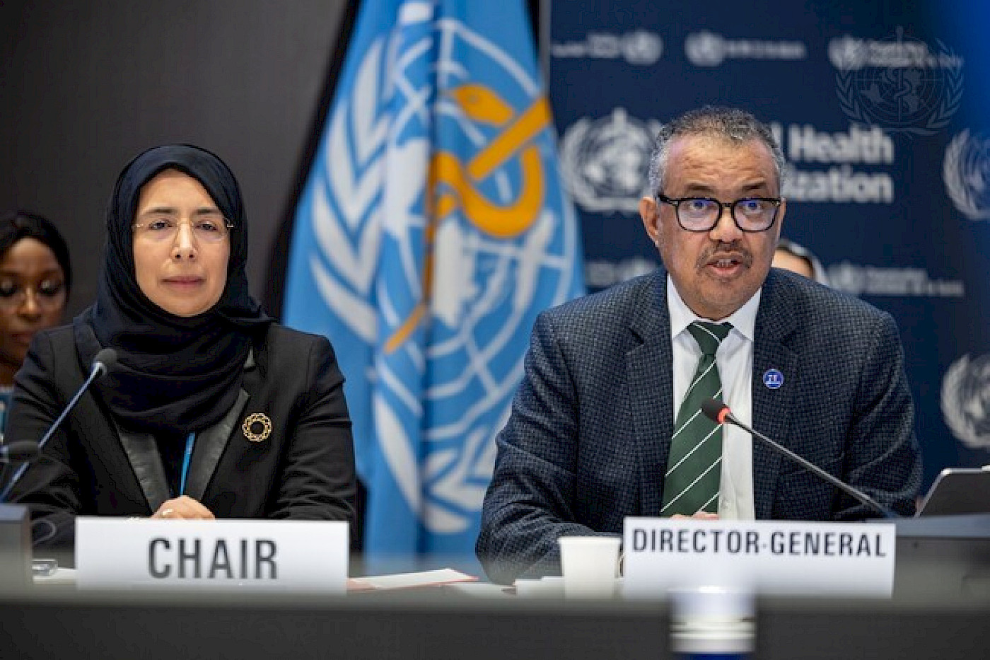Foto: © WHO / Pierre Albouy; DSÖ Yönetim Kurulu Başkanı Katar’dan Hanan Mohamed Al Kuwari (solda) ve DSÖ Genel Direktörü Dr. Tedros Adhanom Ghebreyesus (sağda), 22 Ocak 2024'te İsviçre'nin Cenevre kentindeki DSÖ Genel Merkezinde DSÖ Yürütme Kurulunun 154. oturumunun açılışı sırasında.