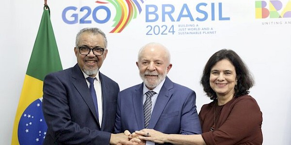 Foto: PAHO / WHO / Karina Zambrana. Brezilya Devlet Başkanı H.E. Luiz Inácio Lula da Silva, Sağlık Bakanı Nísia Trindade ve DSÖ Genel Direktörü Dr. Tedros Adhanom Ghebreyesus, G20 Liderler Zirvesi'nde, DSÖ'nün Yatırım…