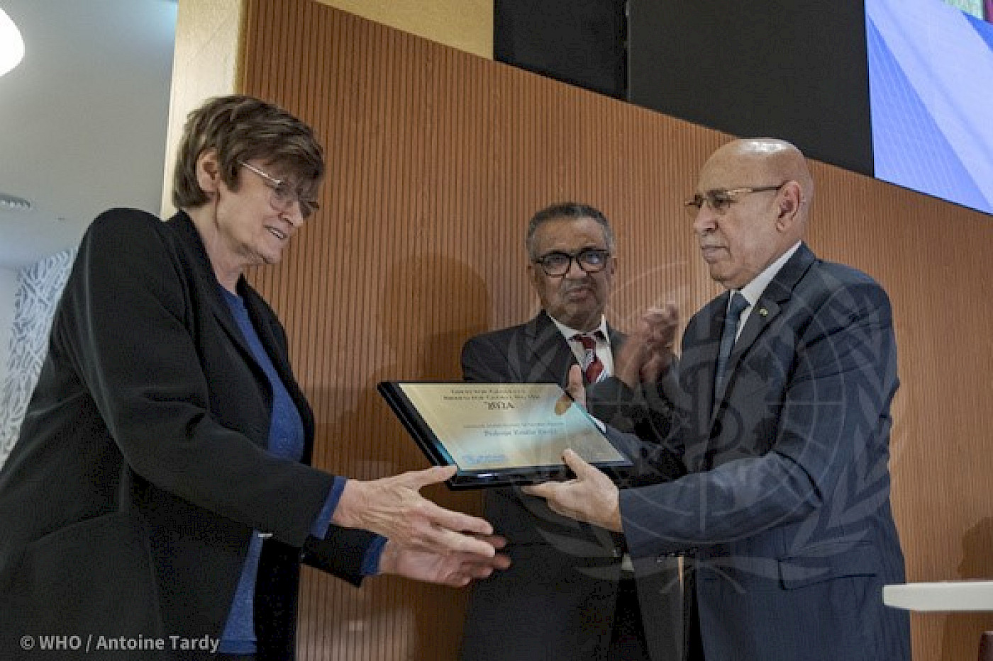 DSÖ Genel Direktörü Dr. Tedros Adhanom Ghebreyesus, 77. Dünya Sağlık Asamblesi'nde Küresel Sağlık Ödülünü Barbados Başbakanı ve iki bilim insanına küresel sağlığın geliştirilmesine yaptıkları katkılardan dolayı takdim etti.