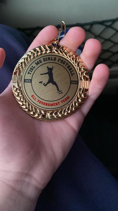 Gol Kraliçesi Derin Balcı'nın madalyası (İstanbul, 5 Ekim 2025)Erkek takımı da finale kaldı ve yine IICS ile oynadı. İlk yarıyı 1-0 geride kapattılar, maç 4-0 bitti ama çok iyi mücadele ettiler. Okulumuza iki kupa birden götürdük. Kız takımı olarak toplam 17 gol attık, bunların 10’u bendendi. Gol kraliçesi oldum ve turnuvanın en değerli oyuncularından biri seçildim. Ortaokuldaki son yılımda kaptan olarak 10 gol, 4 asist ve bir kupa ile eve dönmek benim için hem gurur verici hem de unutulmaz bir deneyim oldu.