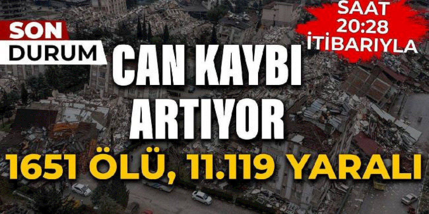 Kahramanmaraş Pazarcık ve Elbistan merkezli, 10 ili etkileyen 6 Şubat 2023 tarihli; 7,7 ve 7,6 büyüklüğündeki depremlerde 3.475 bina yıkıldı, saat 20.15 itibariyle 1.651 kişinin hayatını kaybettiği açıklandı.