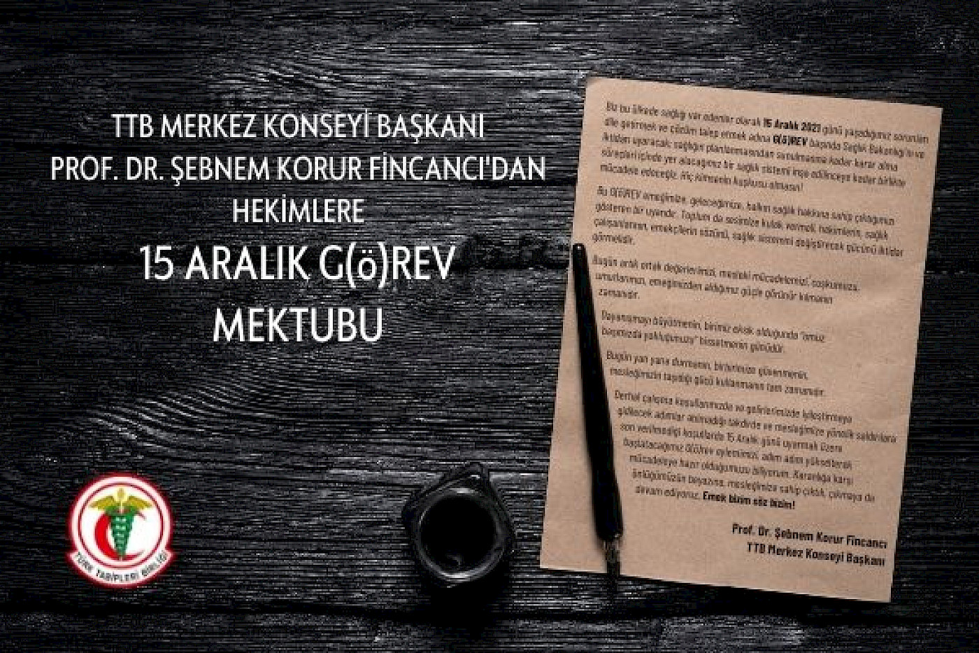 Biz bu ülkede sağlığı var edenler olarak 15 Aralık 2021 günü yaşadığımız sorunları dile getirmek ve çözüm talep etmek adına G(ö)REV başında Sağlık Bakanlığı’nı ve iktidarı uyaracak; sağlığın planlanmasından sunulmasına kadar karar alma süreçleri içinde yer alacağımız bir sağlık sistemi inşa edilinceye kadar birlikte mücadele edeceğiz. Hiç kimsenin kuşkusu olmasın!
