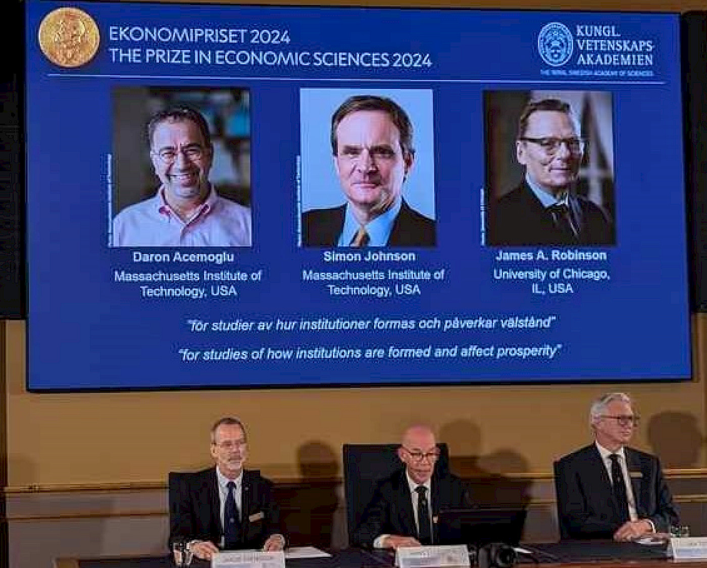 2024 Nobel Ekonomi Ödülü'ne, kurumların oluşumu ve refaha etkilerine ilişkin çalışmalarından dolayı Türk Prof. Dr. Daron Acemoğlu, İngiliz Prof. Dr. Simon Johnson ve İngiliz Prof. Dr. James Robinson'un kazandığı bildirildi.