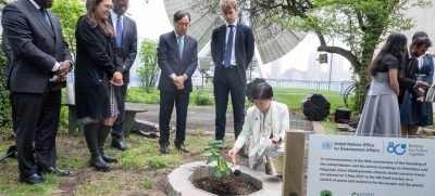 Izumi Nakamitsu, 6 Ağustos 2025'in aynı zamanda BM'nin kuruluşunun 80. yıl dönümü olduğunu belirtti. Mayıs ayında, bombalamadan sağ kurtulan bir hurma ağacının tohumlarından yetiştirilen fidanlar New York'taki Genel Merkez'e dikildi.