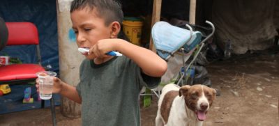 © UNICEF/Jose Vilca; Evi sel nedeniyle yıkılan yerinden edilmiş bir çocuk, Peru, Lima'daki geçici bir barınağın önünde dişlerini fırçalıyor.Bununla birlikte, küresel ağız sağlığının iyileştirilmesi için fırsatlar, ortak risk faktörlerini ele alarak bir halk sağlığı yaklaşımı benimsemeyi içerir.