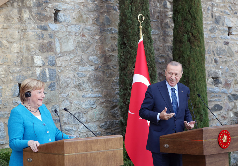 Cumhurbaşkanı Erdoğan, Almanya Başbakanı Merkel ile Tarabya’daki Huber Köşkü’nde bir araya geldi. (16.10.2021, Foto: Cumhurbaşkanlığı)
