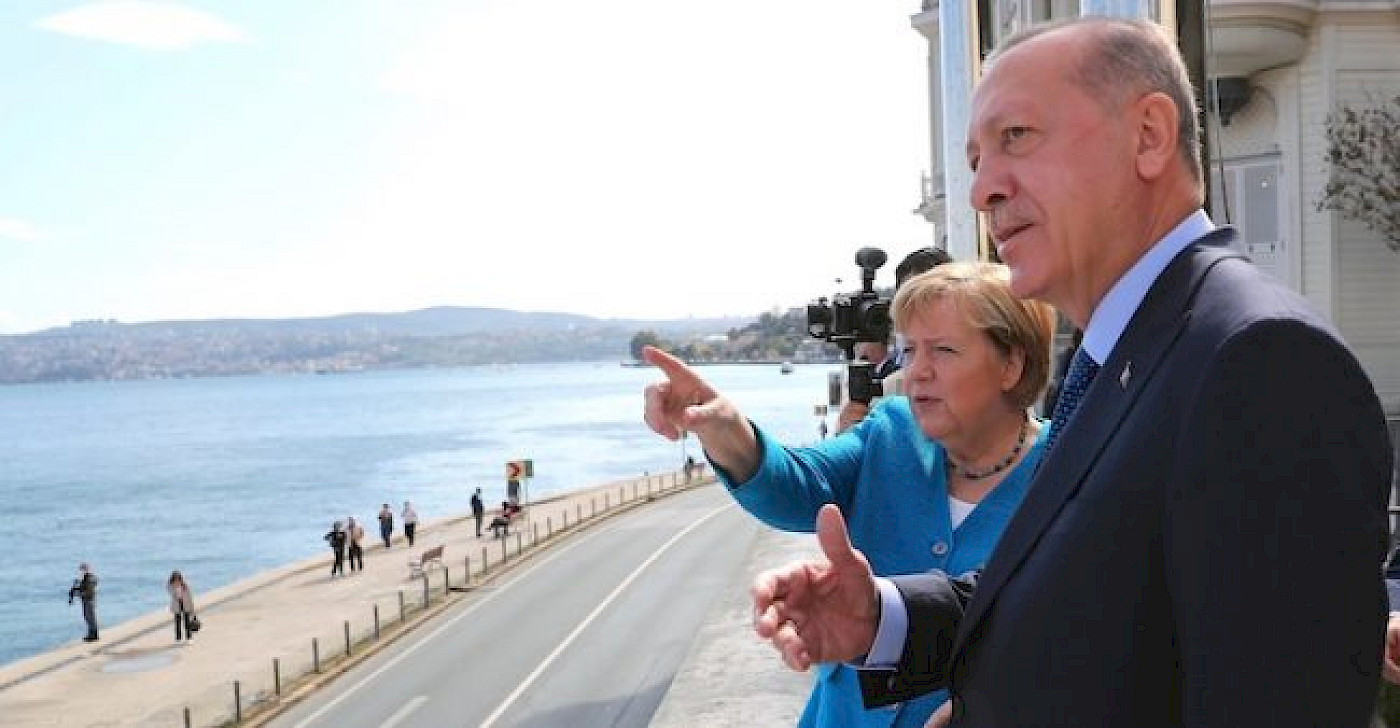 Cumhurbaşkanlığının sosyal medya hesabından Erdoğan ve Merkel’in görüşmesine ilişkin 4 kare fotoğraf paylaşıldı. Fotoğraflarda, Erdoğan ve Merkel’in Huber Köşkü’nden İstanbul Boğazı’nı izledikleri dikkati çekti.