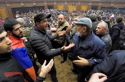 Ermenistan'ın başkenti Erivan'da anlaşmaya tepki gösteren çok sayıda kişi Parlamento Binasını basarak Paşinyan aleyhine sloganlar attı.