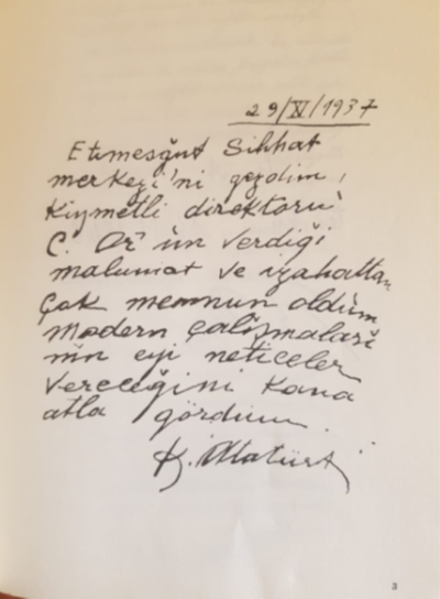 Atatürk’ün Etimesgut Sağlık Merkezine Yaptığı Ziyaret Sırasında Ziyaret Defterine Yazdığı Yazı (29 Kasım1937)