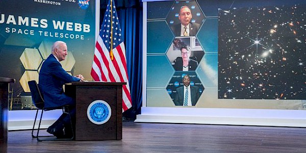 ABD Başkanı Joe Biden, ABD Havacılık ve Uzay Ajansına (NASA) ait, uzayın derinliklerini gözlemleyen James Webb Uzay Teleskobu tarafından çekilen ilk tam renkli fotoğraflardan birini, 12 Temmuz 2022 tarihinde Beyaz…
