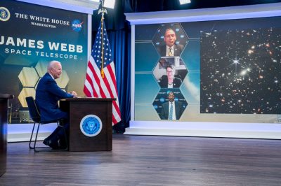 ABD Başkanı Joe Biden, ABD Havacılık ve Uzay Ajansına (NASA) ait, uzayın derinliklerini gözlemleyen James Webb Uzay Teleskobu tarafından çekilen ilk tam renkli fotoğraflardan birini, 12 Temmuz 2022 tarihinde Beyaz Saray'da düzenlenen törende kamuoyuyla paylaştı.