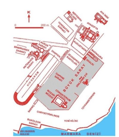 Sultan Ahmet Cami civarında Ayasofya kilisesi uzantısında bir yerde, Bizans İmparatorluk Sarayı yapılmış. Sarayın hemen arkasında, yarışların yapıldığı Hypodrum kurulmuş.