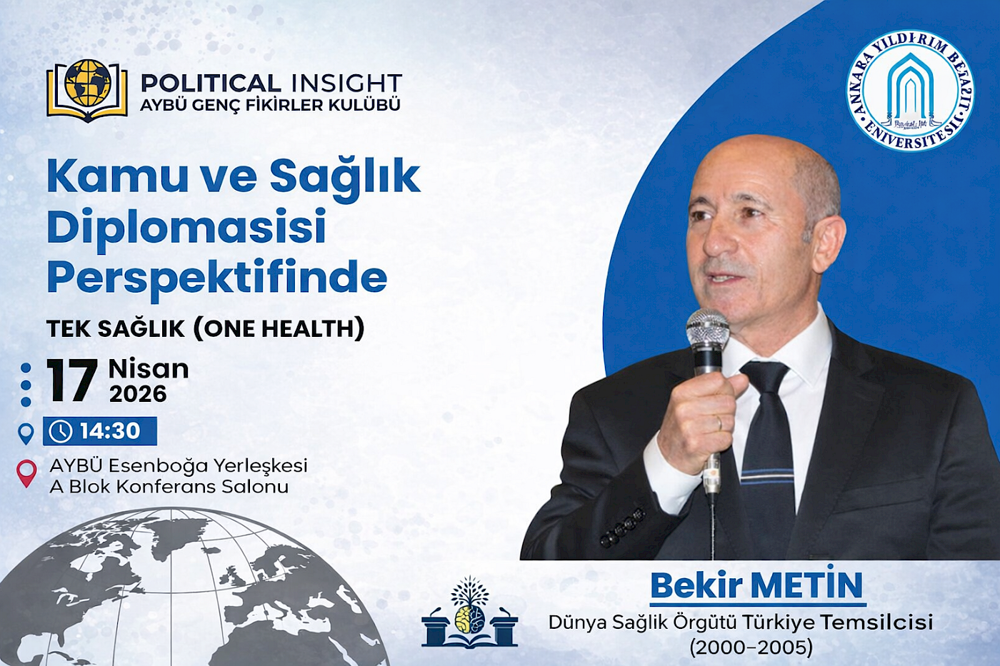Bu makale, 17 Nisan 2026 Cuma Günü Saat: 14.30'da, Ankara Yıldırım Beyazıt Üniversitesi Esenboğa Yerleşkesi A Blok Konferans Salonunda; Dünya Sağlk Örgütü Türkiye Temsilcisi (2000-2005) ve Web Sitesi Gelen Yayın Yönetmeni Bekir Metin tarafından Üniversite öğrencilerine sunulacak "Kamu ve Sağlık Diplomasisi Perspektifinde TEK SAĞLIK" Konferans hakkında bilgi edinilmek üzere hazırlanmıştır.